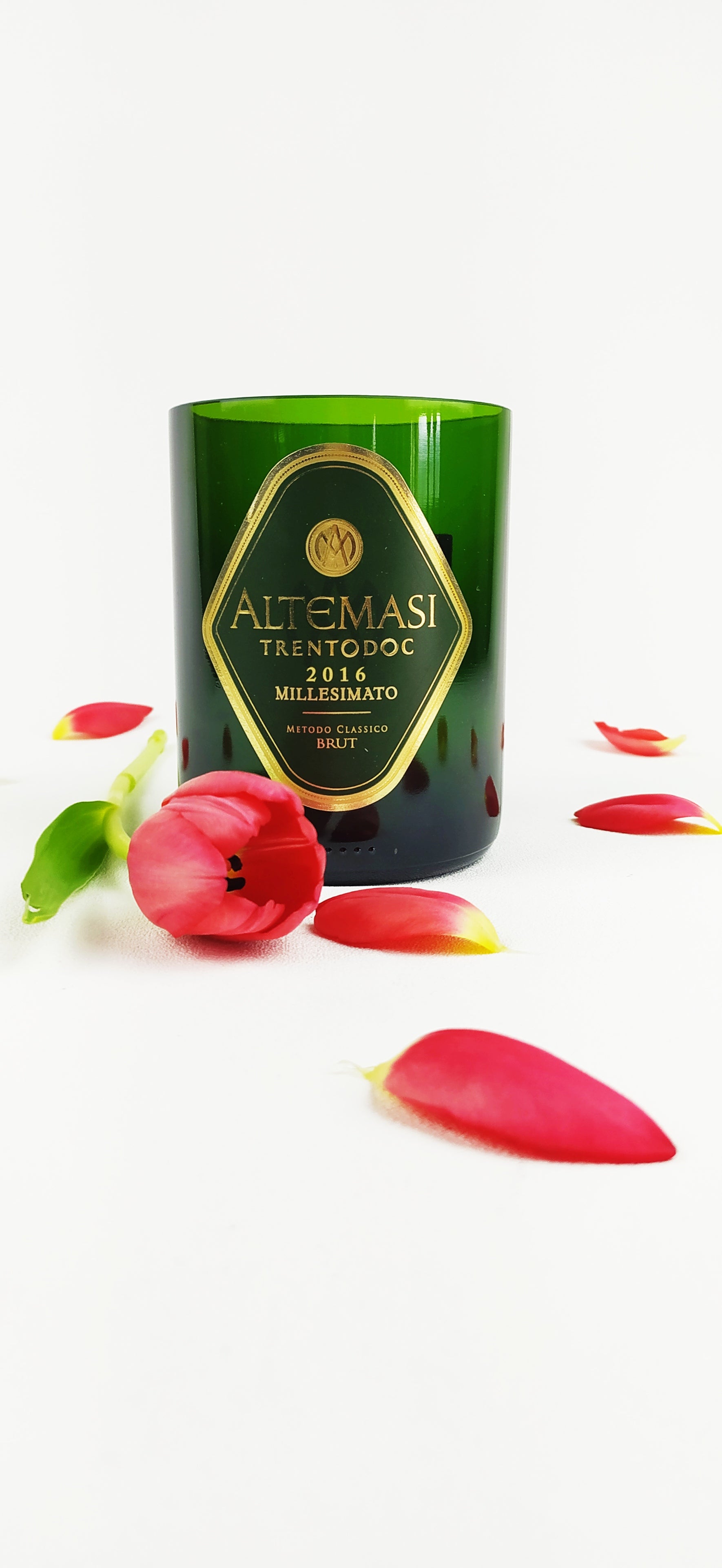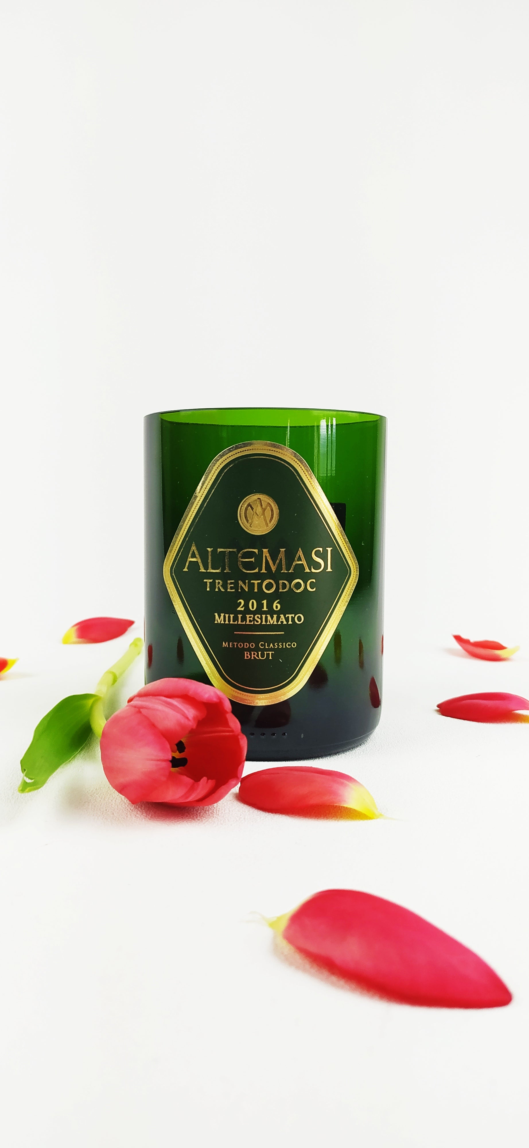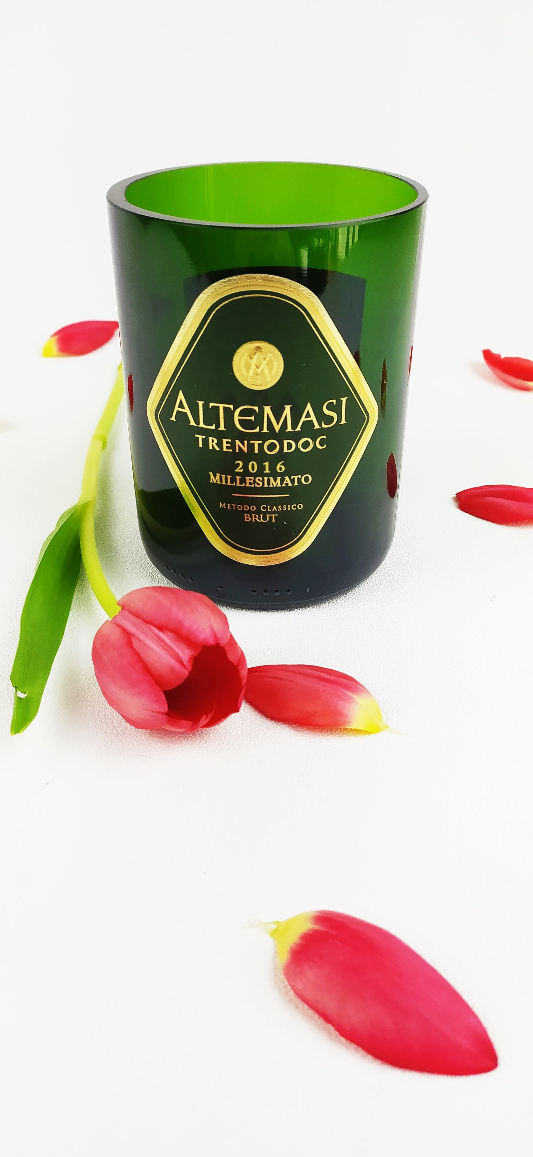 La bottiglie vuota una volta selezionata è stata accuratamente lavata, tagliata, levigata e lucidata con macchinari professionali per garantire l'assenza di bordi taglienti.