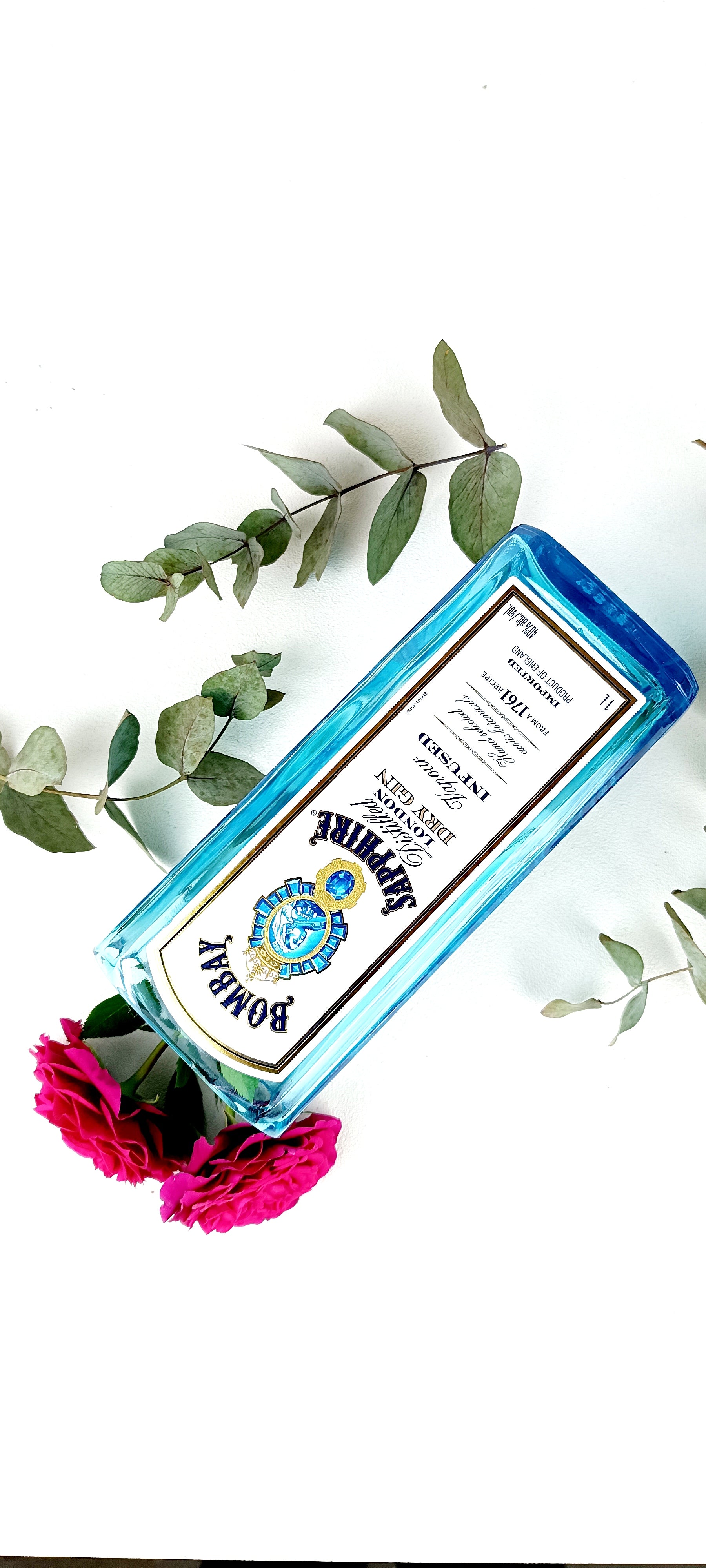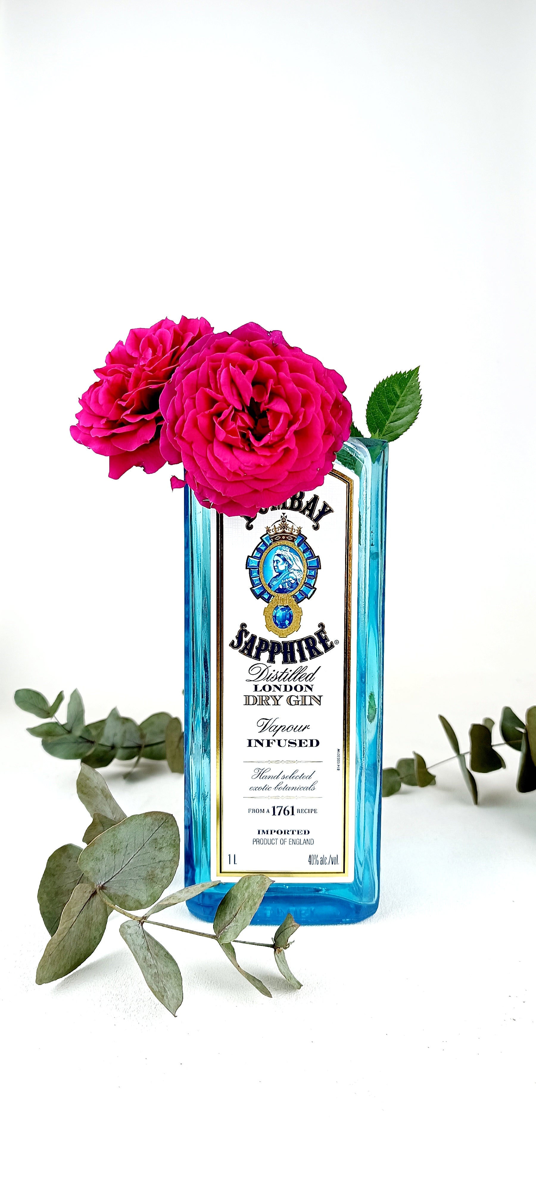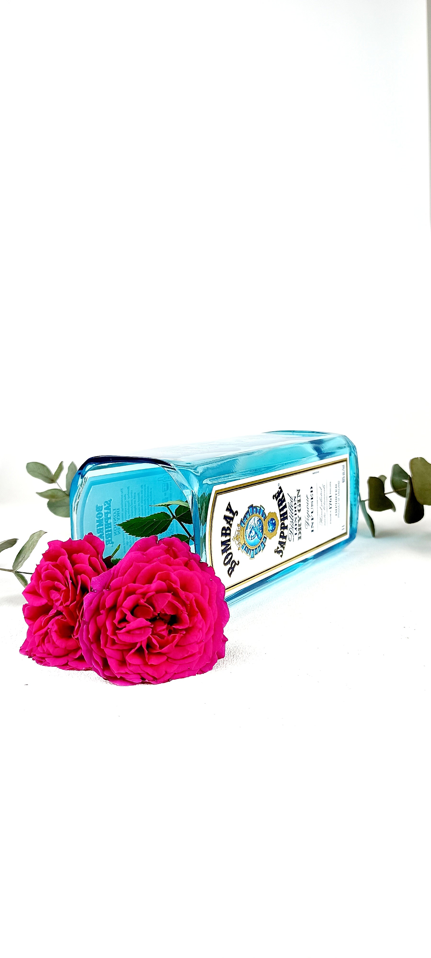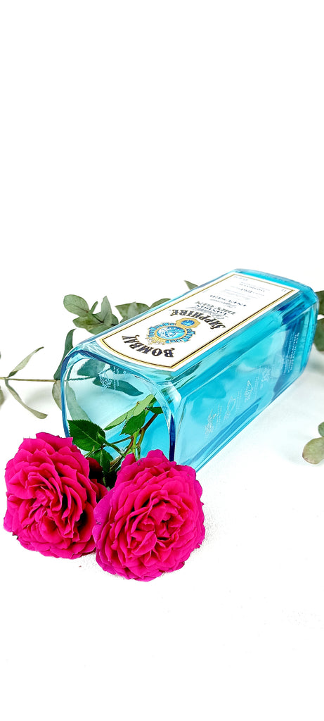 Vaso da fiori realizzato da bottiglia di Bombay azzurra da litro.